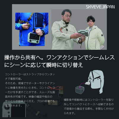 使い手に合わせた柔軟な対応が可能です。 さらに、バックルで簡単にコントローラーを取り外すことができるため、休憩時や移動時、あるいは他のスタッフと映像を共有したいときにもスムーズに対応。